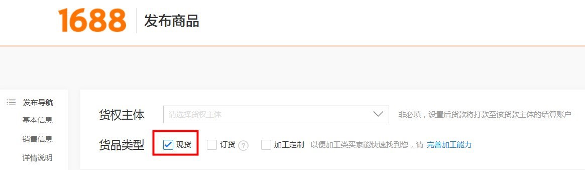 商品发布页面货品类型选择"现货"的商品为现货商品
