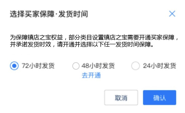 发货保障服务,共3档,分别是24小时、48小时和72小时;